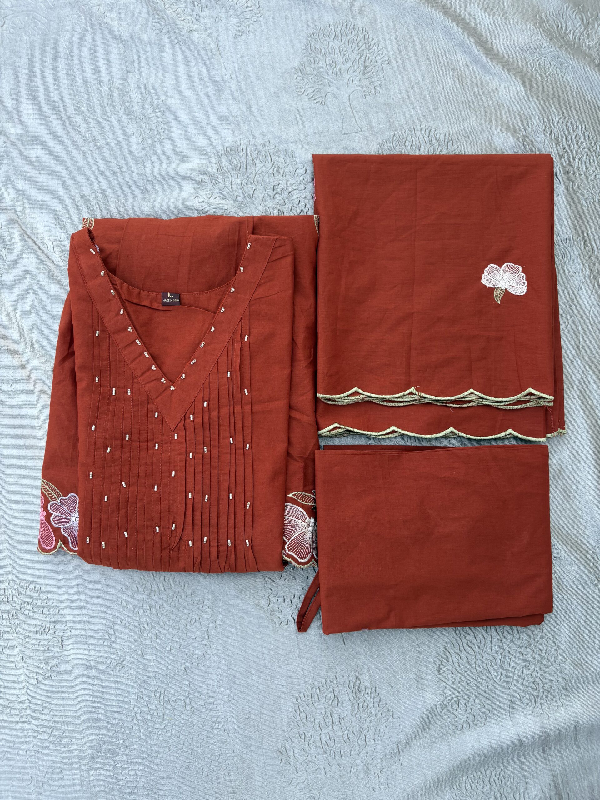 - Dupatta – Lightweight, coordinated dupatta with soft scalloped edges and subtle embroidery